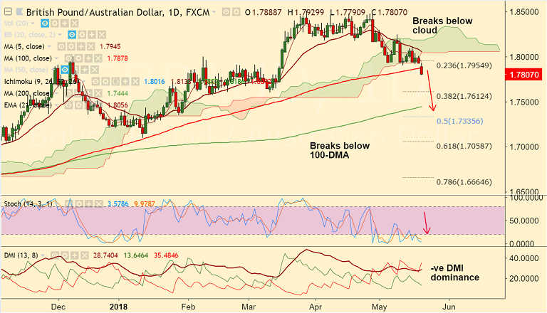 - The pair has broken below strong support at 100-DMA and we see scope for further downside.