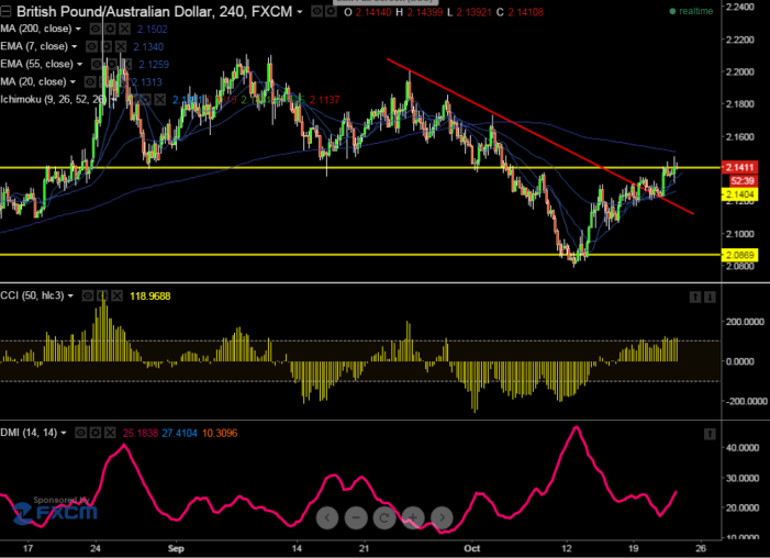 - GBP/AUD has broken minor trend line support around 2.130 and jumped till 2.1470 from that level . It is currently trading at 2.140.