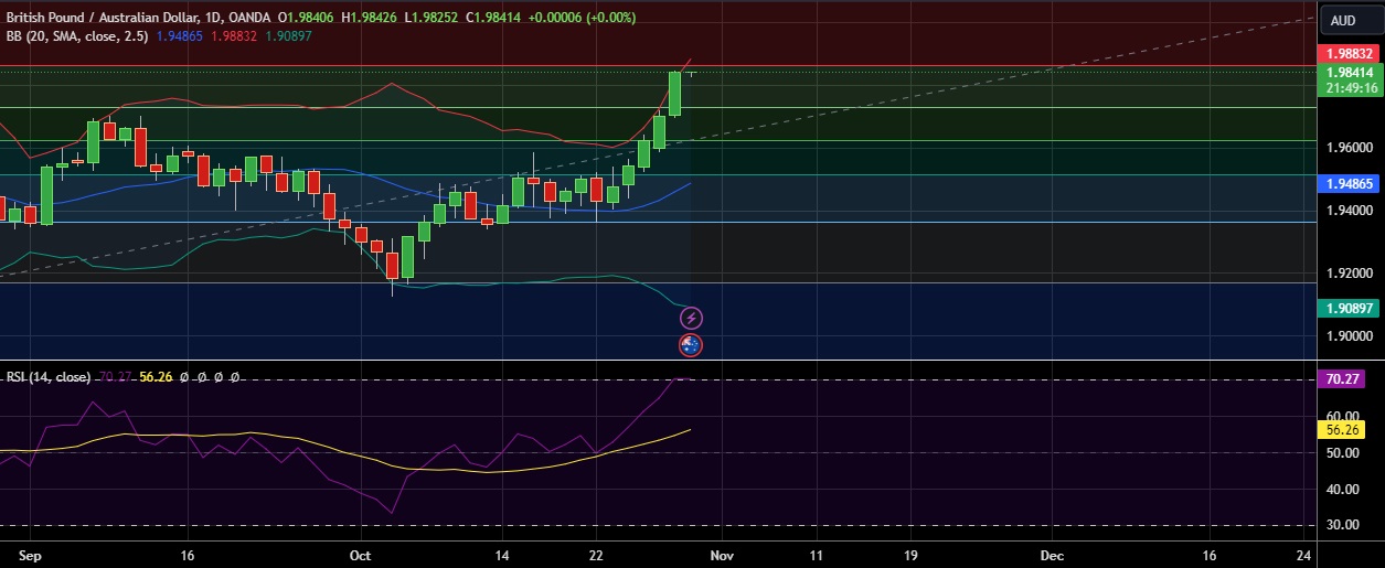 • Immediate resistance is located at 1.9860(23.6%fib), any close above will push the pair towards 1.9883(Higher BB).