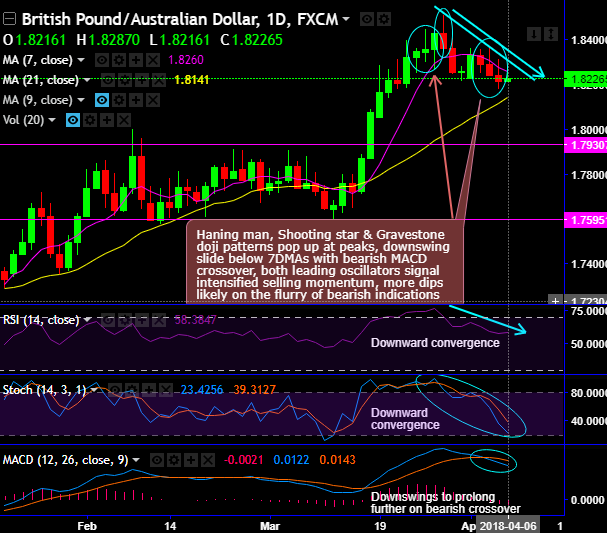 In the minor trend of GBPAUD, hanging man, shooting star and gravestone doji patterns pop up at peaks of 1.8350, 1.8326, 1.8356 and 1.8239 levels, consequently, the downswing slide below 7DMAs with the bearish MACD crossover.