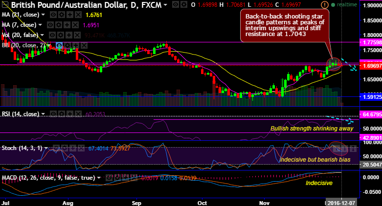 On daily charts, back-to-back shooting star candle patterns are traced out at peaks of interim upswings and stiff resistance at 1.7043.