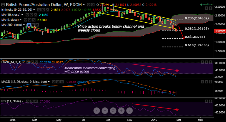 - Price action has broken below channel base and has dipped below the weekly cloud.