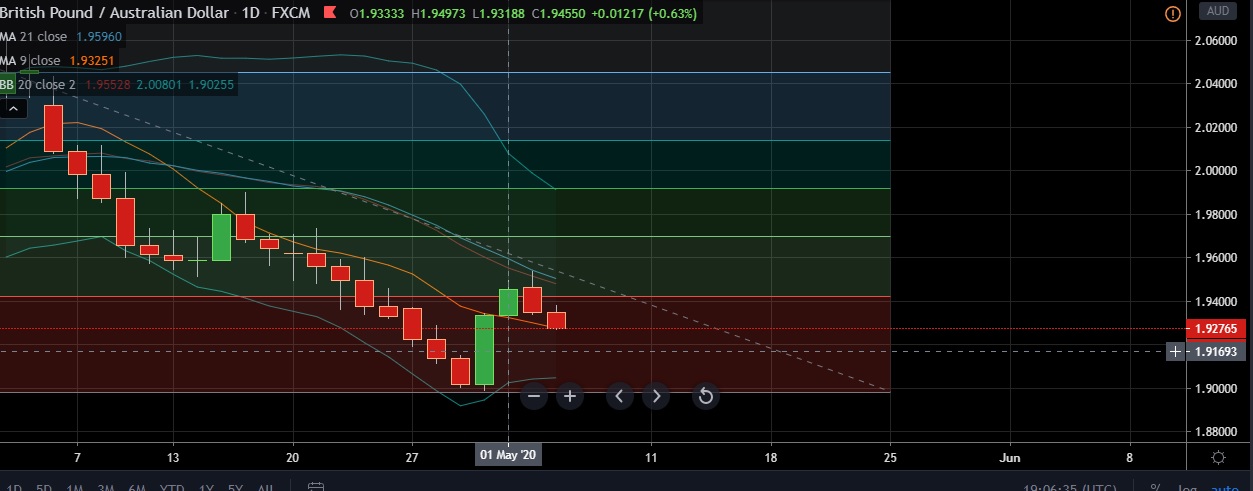 • Immediate support is seen at 1.9275 (9 DMA) and break below could take the pair towards 1.9050 (Lower BB).