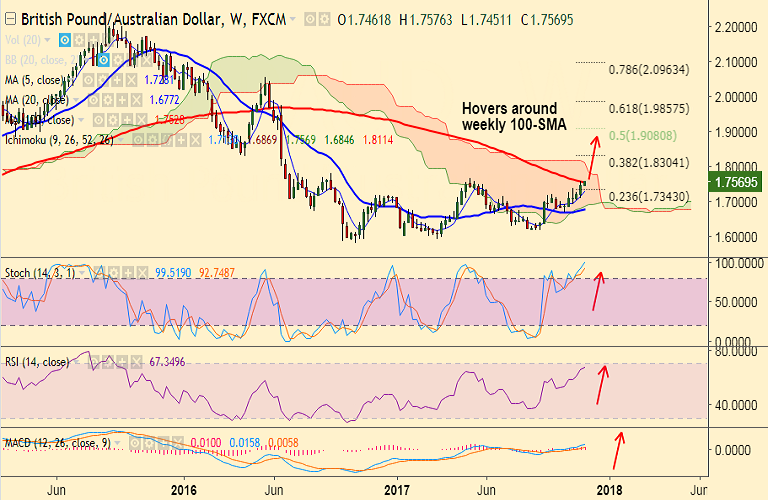 - The pair has breached weekly 100-SMA at 1.7528 and is currently trading around 1.7570 levels.