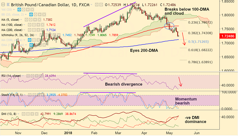- The pair trades with a bearish bias. We see scope for test of 200-DMA at 1.7124.