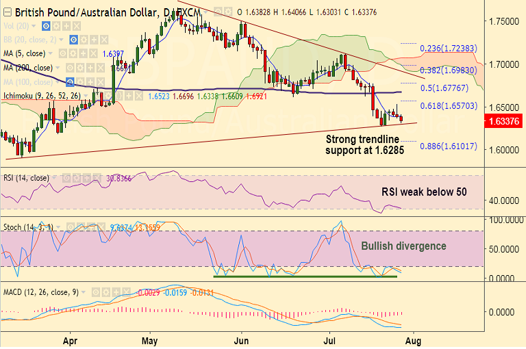Support levels - 1.6285 (trendline), 1.6268 (July 20 low), 1.6180 (Mar 29 low)