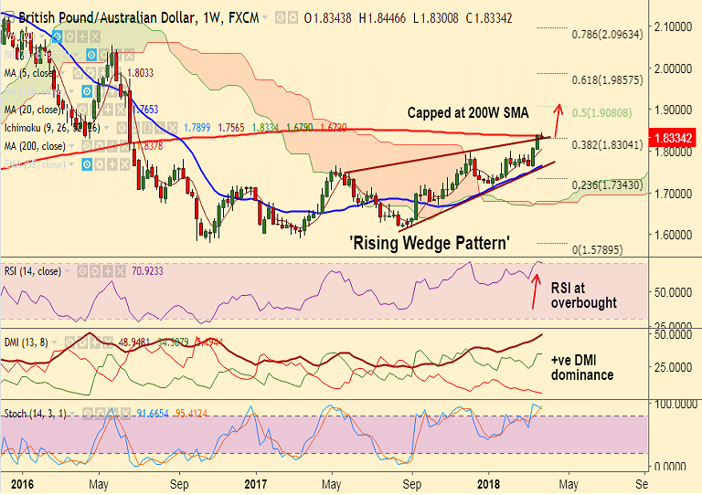 Resistance levels - 1.8378 (200W SMA), 1.8655 (trendline), 1.9080 (50% Fib)