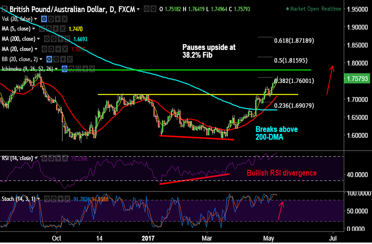 - GBP/AUD has paused upside and has retraced below 38.2% Fib retrace of 2.0530 to 1.5789 fall at 1.76.