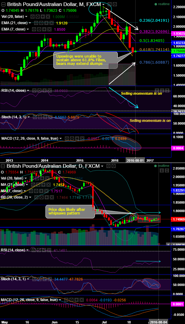 Last month, the breach below crucial supports at 1.7411 (i.e. 61.8% Fibonacci retracement) may expose towards more bearish targets (see monthly charts), bears can load up more weights in shorts as the major downtrend seems to be robust.