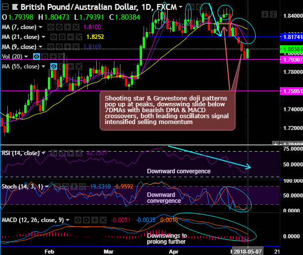 Shooting star, Gravestone doji and bearish engulfing patterns have occurred up at peaks of rallies at 1.8408, 1.8412 and 1.8167 respectively to signal weakness in this pair. Consequently, downswings slide below 7DMAs (refer daily charts).