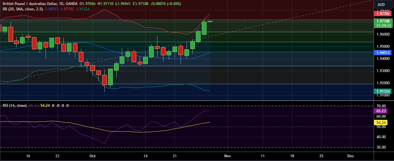 • Immediate resistance is located at 1.9717(23.6%fib), any close above will push the pair towards 1.9753(Higher BB)