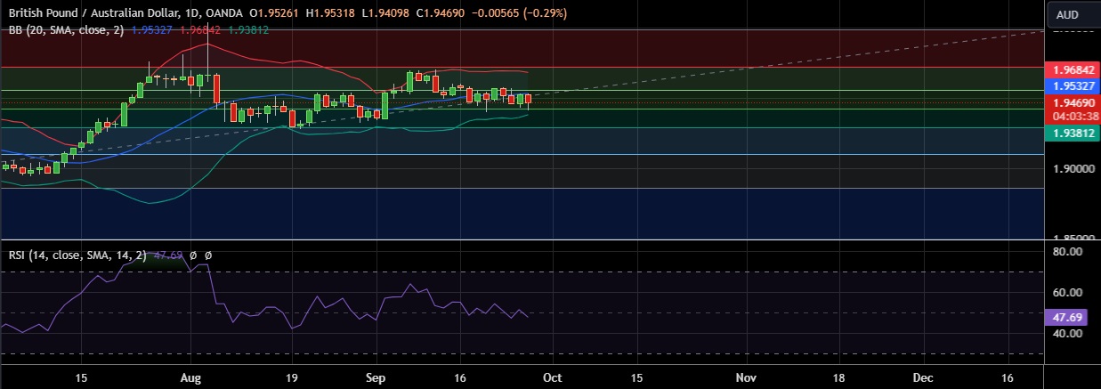 • Strong support is seen at 1.9423(50%fib) and break below could take the pair towards 1.9368 (Lower BB).