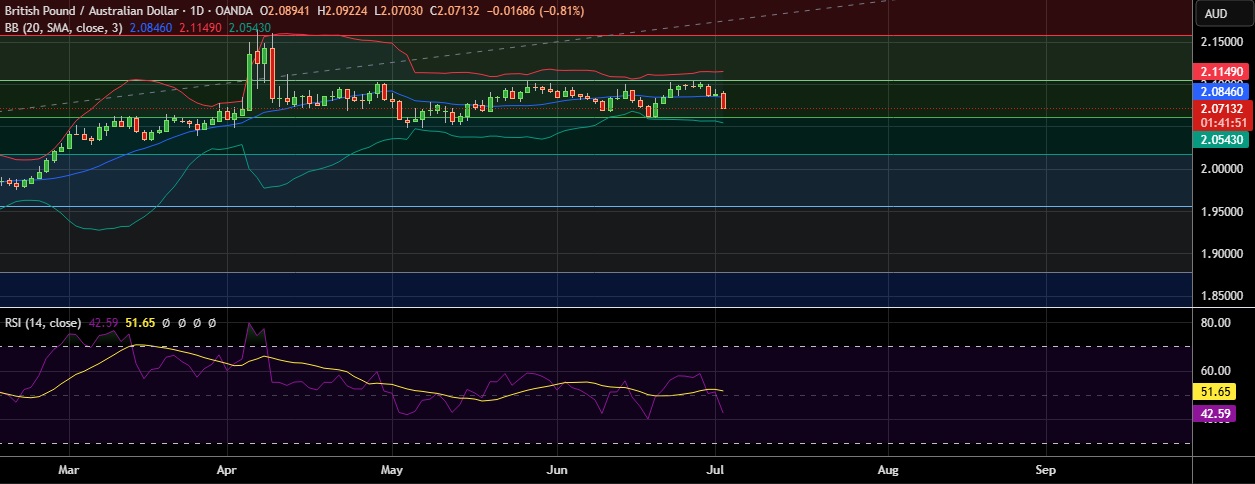 • Support is seen at 2.0611 (50%fib) and break below could take the pair towards 2.0552(Lower BB).