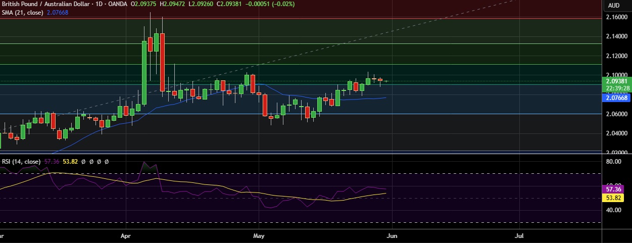 • Strong support is seen at 2.0905(61.8% fib) and break below could take the pair towards 2.0778 (SMA 21)