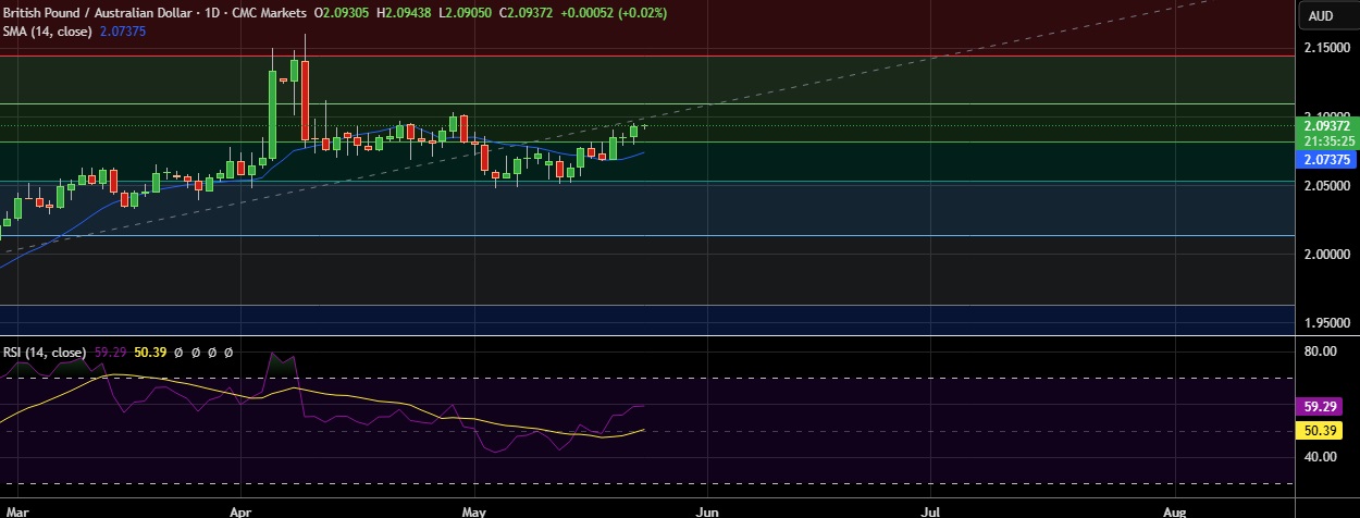 • Immediate resistance is located at 2.1095(38.2% fib), any close above will push the pair towards 2.1285(April7th high).