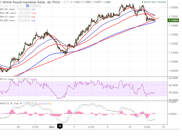 - In the hourly chart the pair is trading well below short and long term MA and near term major support is around 200 H MA at 1.7435. Any close below will drag the pair further down till 1.73490 (50% retracement of 1.70669 and 1.7650)/1.7300.