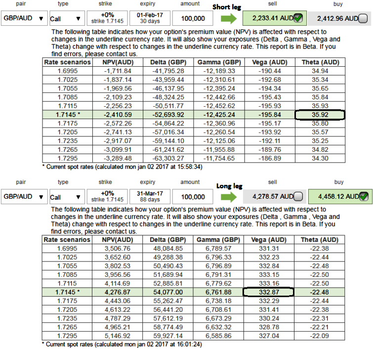 The execution: Initiate long in GBPAUD 3M at the money vega put, long 3M at the money vega call and simultaneously, Short theta in 1m (1.5%) out of the money call with positive theta or closer to zero. Theta is positive; time decay is bad for a buyer, but good for an option writer.