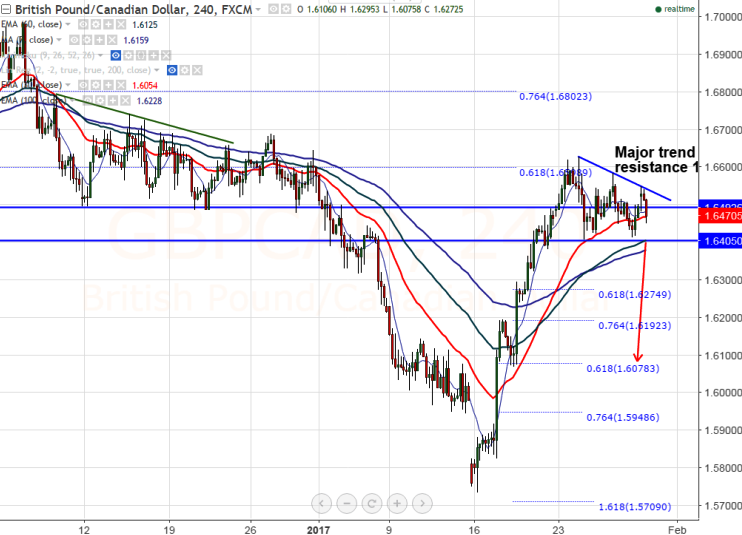 - GBP/CAD shown a steady recovery from the low of 1.57360 made on Jan 16th 2017. The pair jumped till 1.66277 on 24th Jan 2017 and declined from that level. It is currently trading around 1.64536.