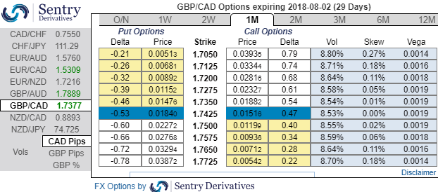 How to execute: At spot reference: 1.7374, initiate long in 1M GBPCAD at the money +0.51 delta call, add one more lot of 1M at the money -0.49 delta put and simultaneously, short 1w (1%) out of the money call with positive theta. The short leg with narrowed expiry (lower side) likely to reduce total hedging cost. Courtesy: Nomura
