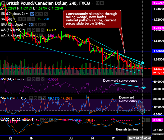 The bearish pressure is again observed despite today’s upswings, bulls restrained at around 21SMA levels, as the robustness in both short and long term bearish sentiment gets confirmation from today’s shooting star and yesterday’s railroad candlestick patterns. Shooting star has occurred at 1.6287 and railroad pattern has occurred at 1.6302 levels.