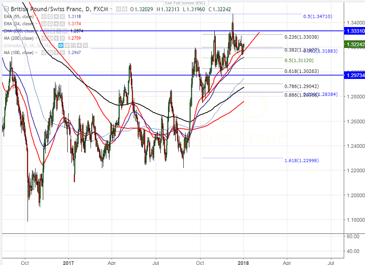 - GBPCHF is declining after forming a top around 1.34695 on Dec 8th 2017. The pair hits low of 1.3140 and shown a minor jump till 1.32215. It is currently trading around 1.32214.