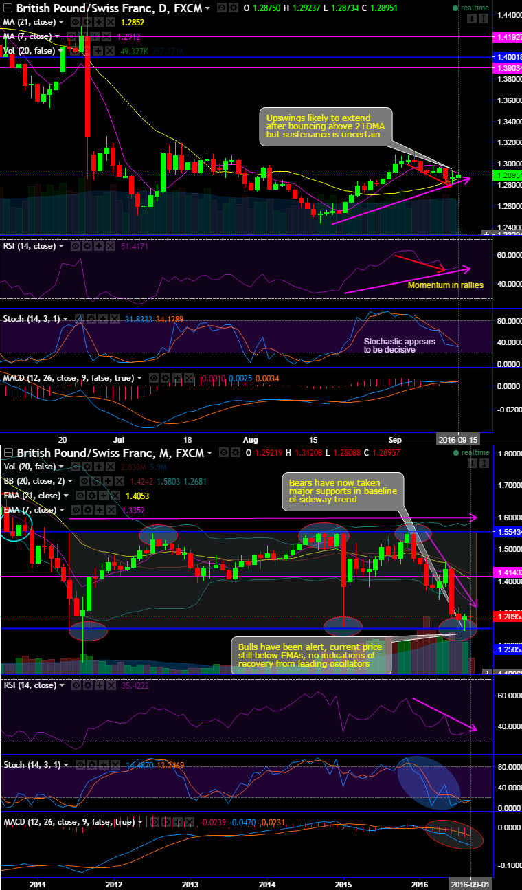On the flipside, from last two days, the bulls of this pair seem to have snapped the gains at 7-DMA, we foresee more gains given break out above resistance at 1.2912 levels (7-DMA).