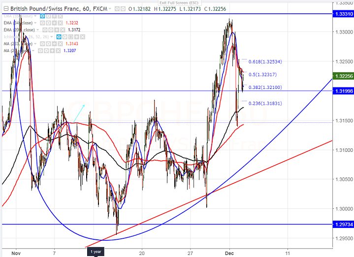 - GBP/CHF has shown a major selling after hitting high of 1.3326 on Dec 1st 2017. The pair declined after hitting low of 1.31389 and jumped till 1.32536. The slight dip in GBP was due to uncertainty on Brexit negotiations. UK PM Theresa May is set to meet Claude Jucker EU commission president and will try to reach a deal on Brexit divorce. It is currently trading around 1.32265.