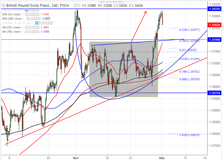 - GBP/CHF has shown a massive recovery from the low of 1.3000 made on Nov 28th 2017 on positive Brexit progress. The pair breaks major resistance at 1.31850 high made on Nov 21st 2017 and jumped till 1.3320 yesterday. The main jump in GBP was mainly due to positive progress happening between EU and British negotiators. It is currently trading around 1.32433.