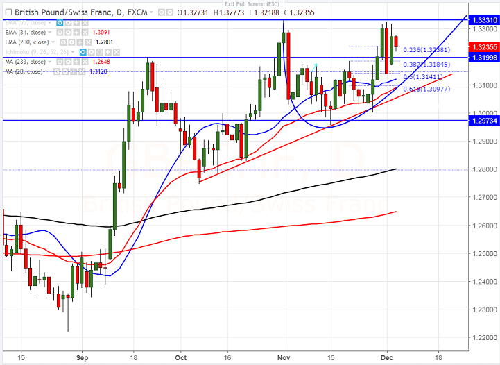 - GBP/CHF has shown a major selling after showing a minor jump above 1.3330 yesterday. The pair declined till 1.3234 and is currently trading around 1.32344. The slight dip in GBP was due to uncertainty on Brexit negotiations. UK PM Theresa May and EU failed to reach agreement in Brexit negotiations. Pound sterling reversed its gains after no deal was made between UK and EU on Brexit negotiations.