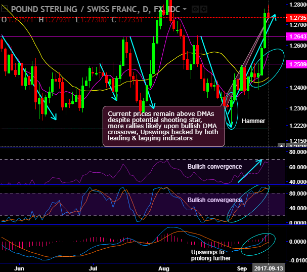 On an intraday trading perspective, contemplating today’s overbought pressure one can initiate tunnel spread strategy using upper strike at 1.2793 (day highs) and lower strike at 1.2643 (next strong support). The strategy is likely to fetch leveraged yields as long as underlying spot FX keeps dipping but within lower strikes on or before the binary expiry duration.
