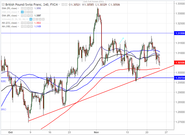 - GBP/CHF has formed a temporary bottom at 1.2955 and recovered sharply from that level. The pair hits high of 1.31850 and shown a minor decline. GBP was trading higher against all majors on account of positive developments on Brexit and good economic data. It is currently trading around 1.30500.