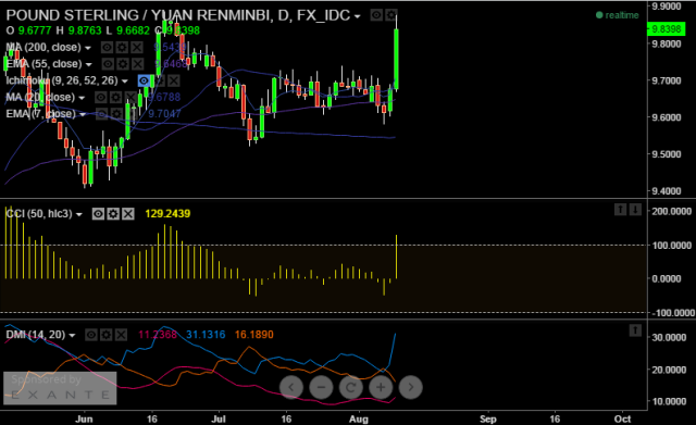 - The unexpected PBOC's decision to depreciate its currency has pushed GBP/CNY to 10-month high at 9.8763 levels. It currently trades at 9.8398 levels.