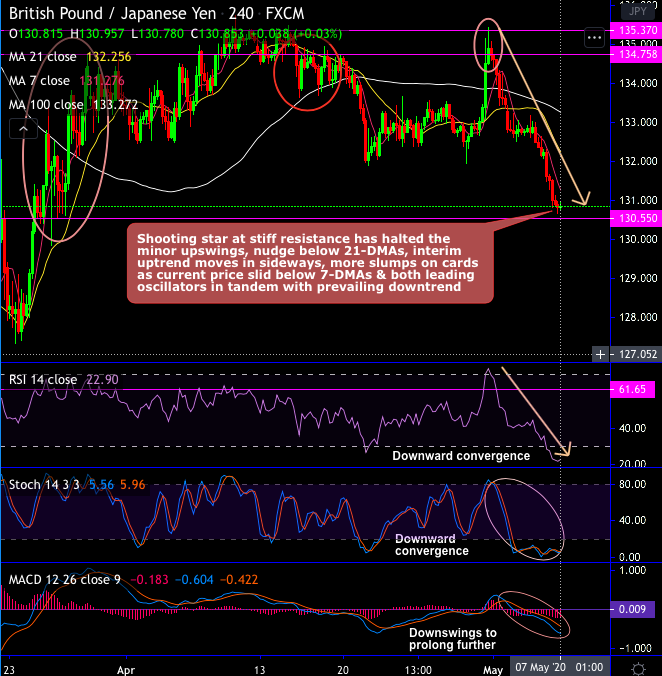 Trade tips: At spot reference: 130.824 levels (while articulating), contemplating above technical rationale, one can execute one touch put options using lower strikes at 130.500 levels. Such exotic option will participate in downside movement and fetch leveraged yields as compared to spot.