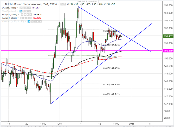 - The pair should close convincingly above 151.65 (trend line resistance) for the next minor jump. Any close above 151.65 will take the pair to next level till 153/153.40. It should break above 153.40 for jump till 155/157.