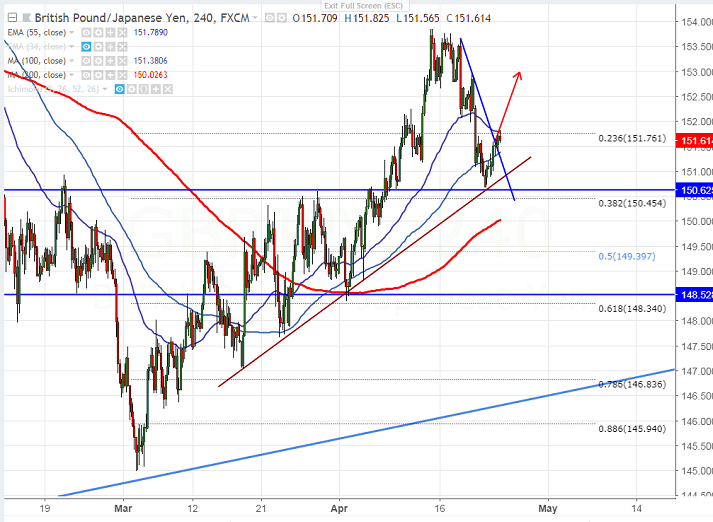 - On the lower side, near term support is around 151.40 (100- 4H MA) and any close below will drag the pair till 150.50/150.
