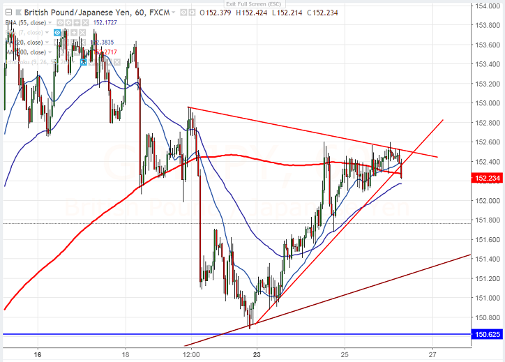 - The pair hits low of 152.08 yesterday and shown minor recovery till152.59. It is currently trading around 152.23.