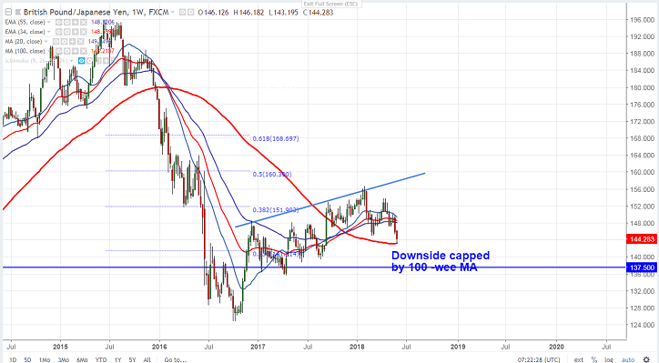 - GBP/JPY has halted its one week weakness and shown a minor recovery from the low of 143.20 (100- W MA). The pair lost almost 700 pips from the minor top formed at 150 on account of increasing geo political uncertainty especially in Italy. GBP hits low of 1.32045 and shown a minor recovery on account of profit booking. USD/JPY has shown a minor recovery from low of 108.12 (100- day MA) and is currently trading around 108.78. GBPJPY is currently trading around 144.33.