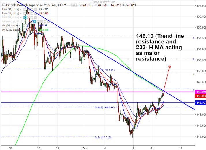 - On the higher side, near term major resistance is around 149.10 (233- H MA and trend line joining 152.86 and 151.60) and any break above confirms intraday bullishness, a jump till 150.25/151.60 likely.