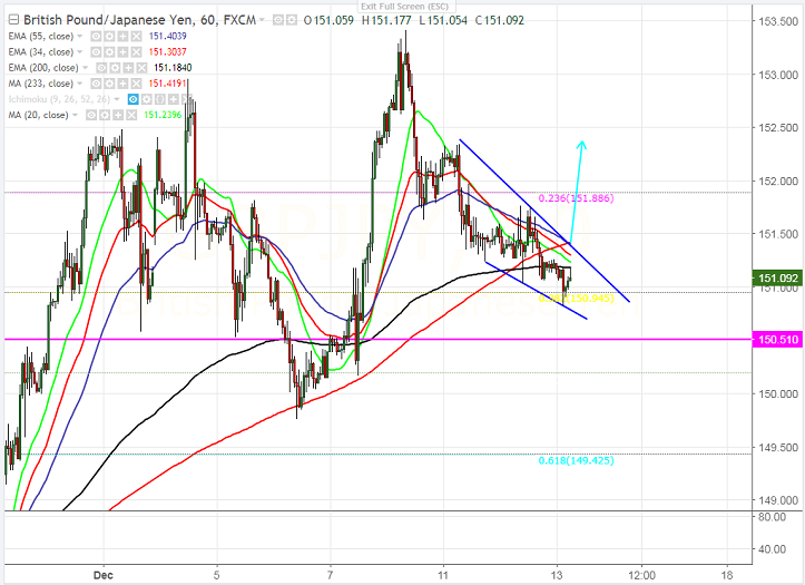 - GBP/JPY declined sharply after forming a temporary top at 153.41(Dec 8th 2017 high). The pair dipped till 150.83 and is currently trading around 151.28.