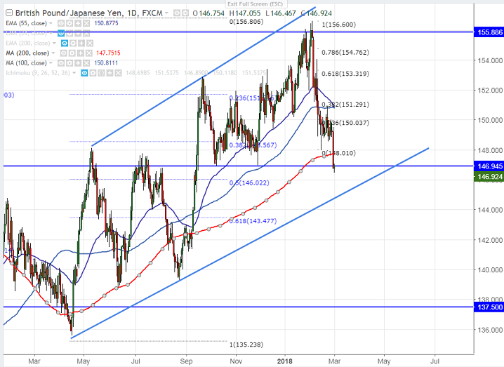 - The GBP was declining due to strong USD after positive statement by Powell on US economy increased hopes of more than three rate hikes in this year. Another round of Fed chairman Powell talks was major event to be watched for the day. GBP/JPY’s near term resistance is around 147.75 (200- day MA) and any break above will take the pair to next level till 148.50 (support turned into resistance)/149. Any close above 150 confirms minor bullishness, a jump till 150.50/150.82.