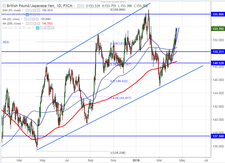 - GBP/JPY has recovered sharply after declining almost more than 100 pips yesterday. Pound sterling was trading higher for past three weeks and broken high made on 1.43455 Jan 25th 2018. The pair jumped almost 400 pips in month of Apr till now on hopes of rate hike by BOE. The pair hits low of 152.65 and shown a 100 pips jump from that level. It is currently trading around 153.74. Market eyes UK employment data to be released today for further direction.