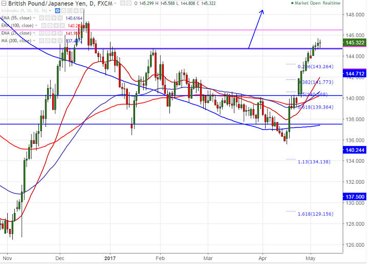 - On the higher side, daily closing above 145 will take the pair to next level 146.30/147.40.Any break above 147.40 will take the pair to the high of 148.45 (Dec 15th 2016 high).