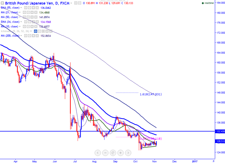 - The pair slightly jumped after declining till 126.40 today. GBP/JPY should break above 34- day EMA for further bullishness. So slight bullishness can be seen only above 129.35 and any break above targets 130.11/132.