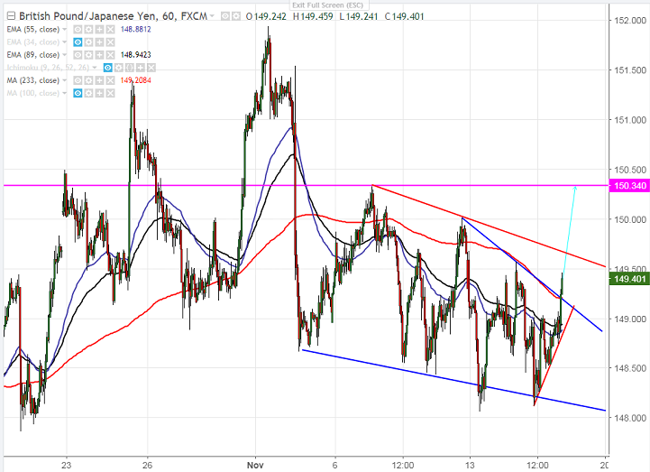 - GBP/JPY recovered slightly after forming a minor bottom around 148.15. The pair broken minor trend line resistance 149.20 and jumped till 149.45. It is currently trading around 149.41.