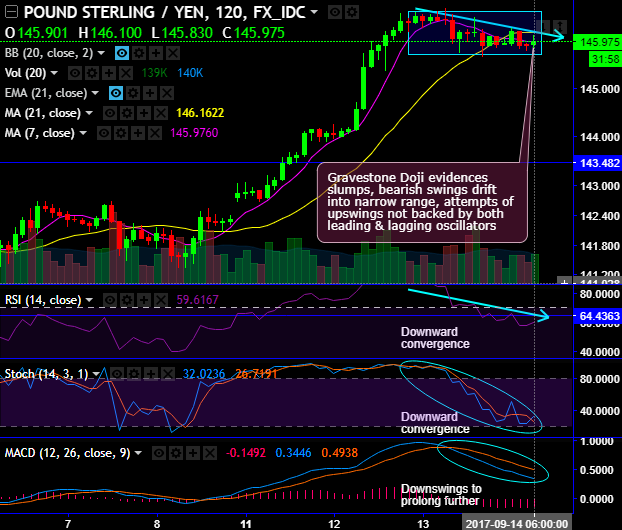 Gravestone dojis are formed at 146.416 and 146.158 levels. Ever since these bearish patterns have occurred, the previous bull trend has halted and bears manage to evidences slumps; for now, the bearish swings drift into a narrow range, attempts of upswings not backed by both leading & lagging oscillators (refer 2H chart). Instead, more dips are foreseen on bearish DMA crossover
