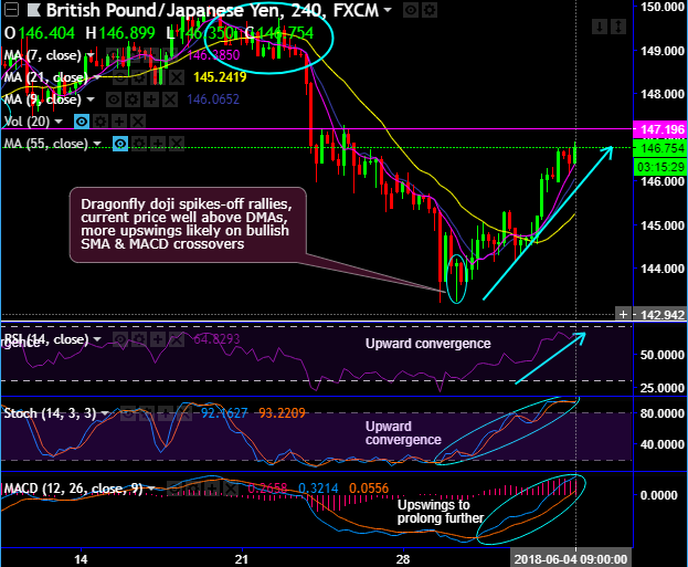 Technical chart and candlestick patterns occurred: Dragonfly doji occurs at 144.100 levels that spikes-off rallies, subsequently, the current price well above DMAs. For now, upswings seem most likely to be extended on bullish SMA and MACD crossovers (refer 4H chart).