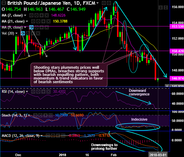 GBPJPY has tumbled into deep tunnels ever since the formation of shooting star at peaks of rallies at 153.841 levels which is exactly at rising wedge resistance line.