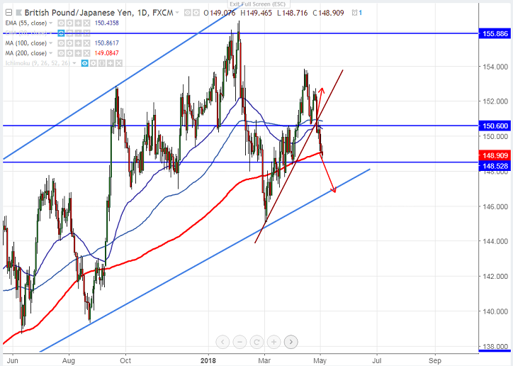 - GBP/JPY is trading weak once again after a minor recovery above 150 yesterday. The pair jumped till 150.12 and declined more than 100 pips from that level. GBP recovered slightly against USD but slight recovery was using as opportunity for selling by traders. UK services PMI came at 52.8 for the month of Apr compared to forecast of 53.5. The pound sterling’s overall trend is still weak due to weak economic data and Brexit uncertainty.