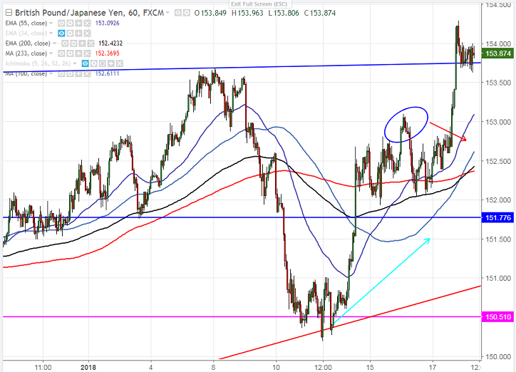 - The major resistance is around 154 and any break above will take the pair till 155/155.84 (161.8% fibo).