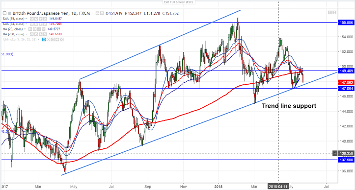 - GBP/JPY is continuing its weakness and has declined more than 100 pips yesterday due to strong yen. US trump tweet regarding US –China trade negotiations has strengthened yen on account of rising geo political tensions. GBP was trading weak against all majors after Dovish comment for m BOE Governor Carney yesterday. USD/JPY declined more than 100 pips from the high of 111.39 on account of renewed geo political tensions. But GBP was trading weak against all majors especially with USD. Cable declined sharply almost 100 pips yesterday after showing a minor jump till 1.34915. Markets eyes UK CPI report for further direction. GBPJPY hits low of 147.86 and is currently trading around 147.59.